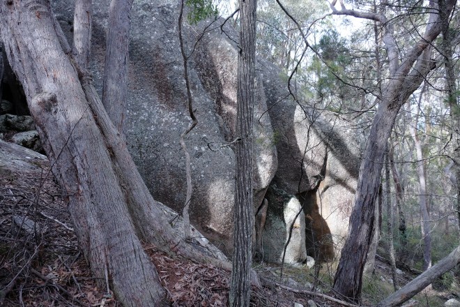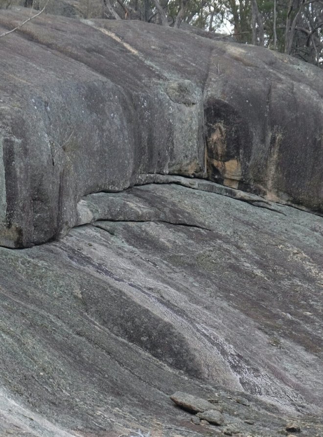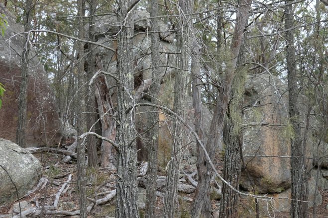 A stone ledge or entire granite hillside, a group of ancient lichen covered boulders giving pause to reflect on the formative geological processes in deep time, their volumes misted by acacia and melaleuca foliage.