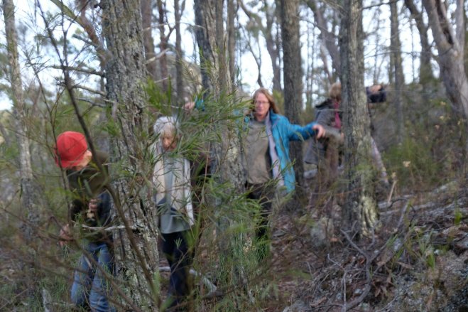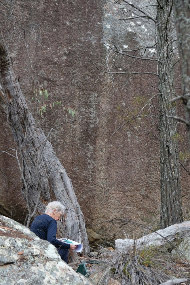The workshop day began with an early morning immersive walk through the forest and over the granite escarpment. Here, the geometric moss-green spires of cypress pines within a grey and white tangle of Angophra and stringy bark, and there, the weathered waves of grey granite dissolving in the light and brought into visual focus by textures of lichen, algae and moss.